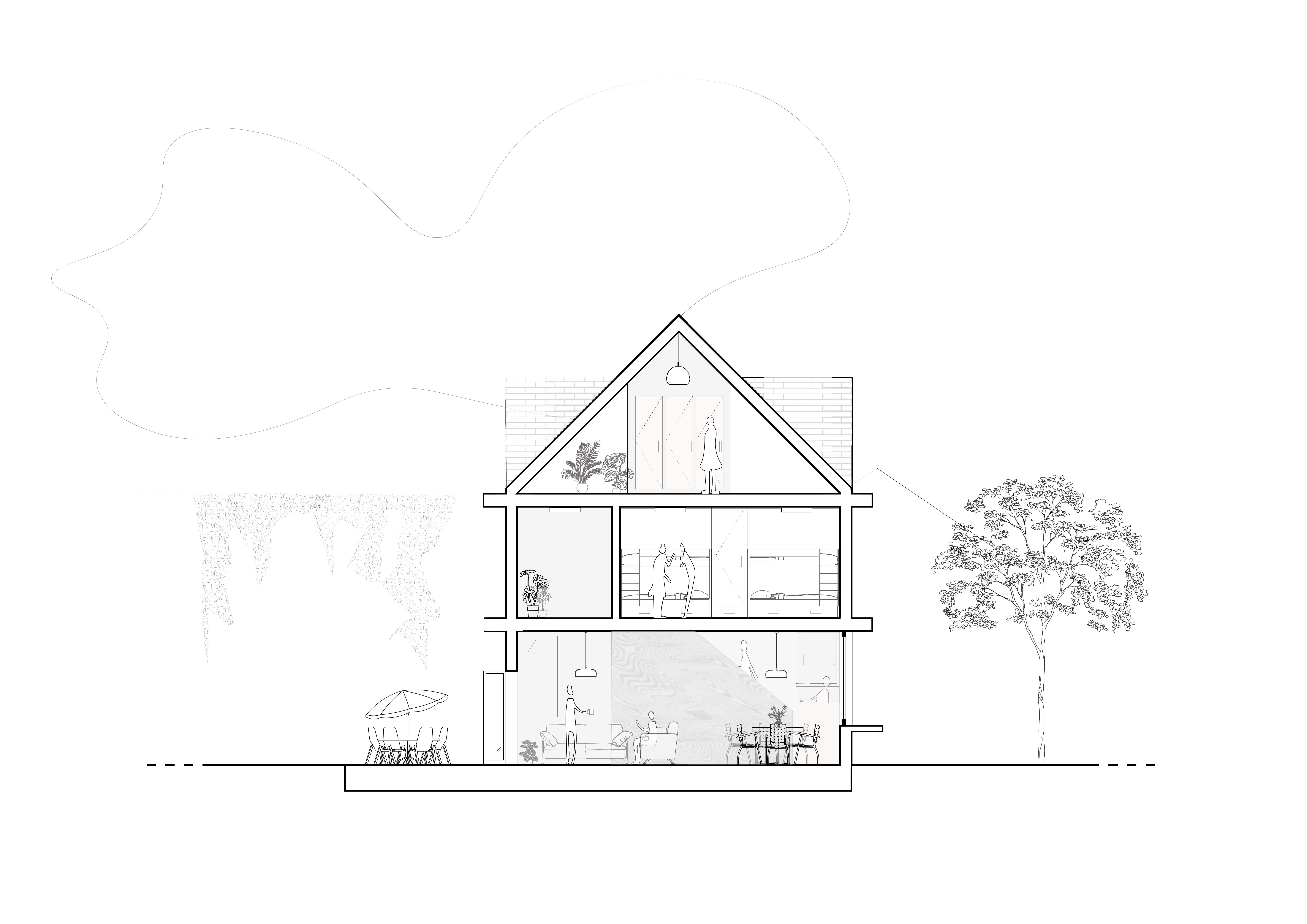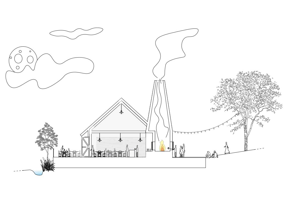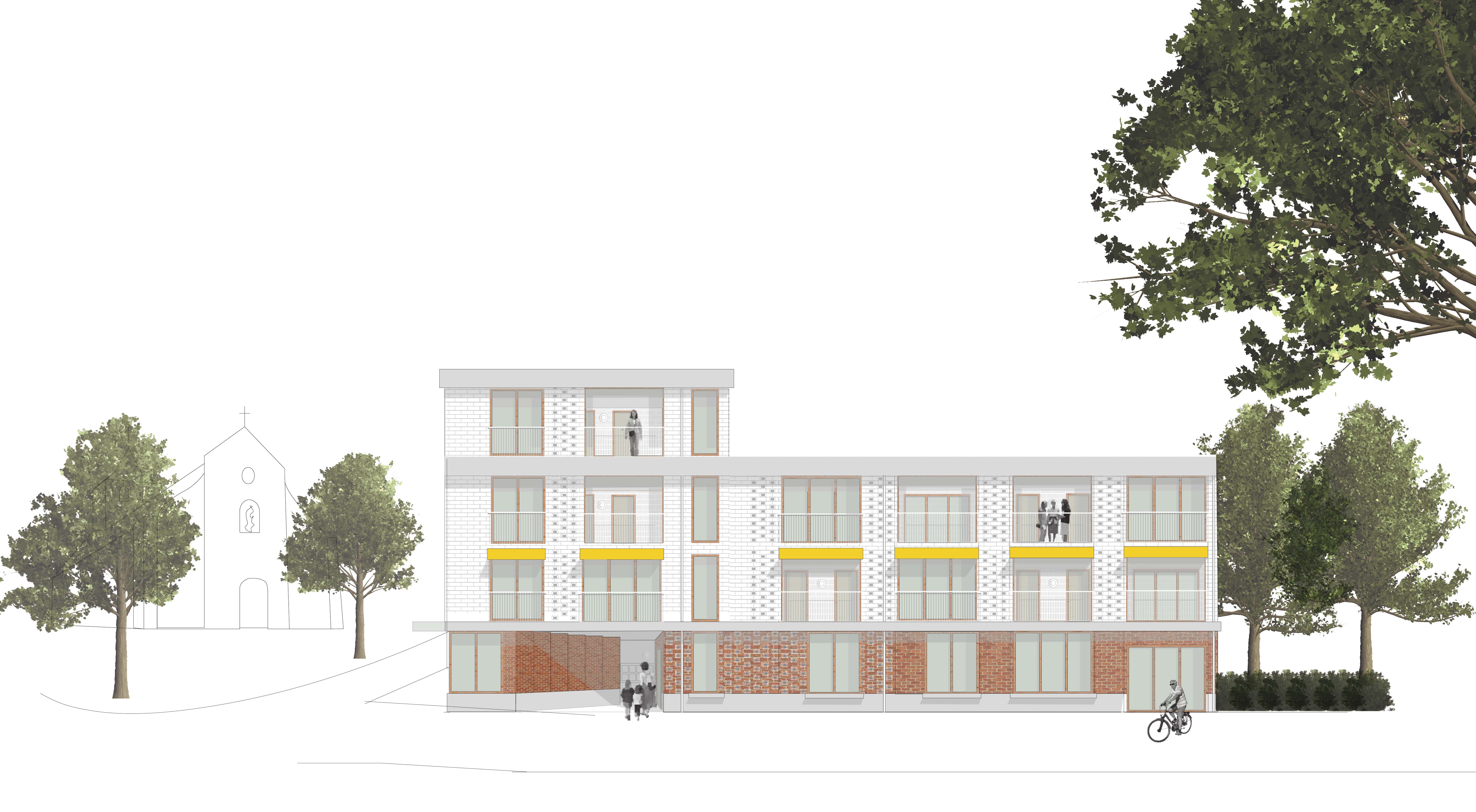 Grenzend aan het kerkplein ontstaat een nieuw dorpsplein, met een levensboom als centraal symbool. Rond dit plein komen een afspanning met herbergruimte, een cohousingproject met een sociale mix van ouderen, jongeren en mensen met een beperking, en een multifunctioneel bakhuis dat zich aanpast aan de seizoenen: gesloten en warm in de winter, open als luifel in de zomer.
