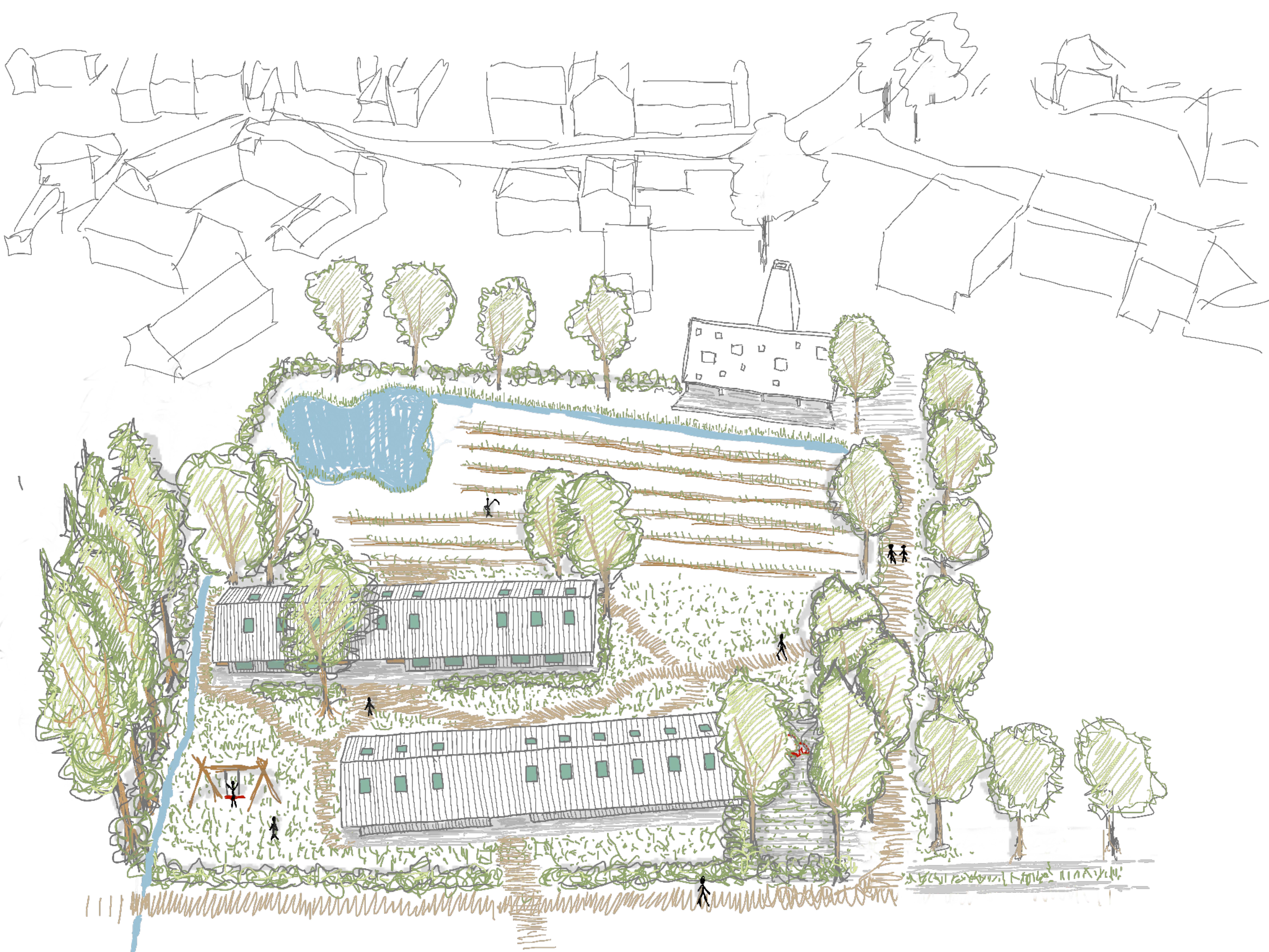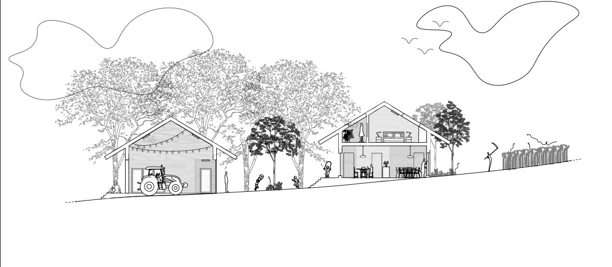 In de vallei wordt een modulaire, tijdelijke herenboerderij opgebouwd waar landbouw- en niet-landbouwfamilies samenleven. Het project hertekent het dorpsleven met oog voor collectiviteit, toegankelijkheid en verbondenheid met het landschap.
